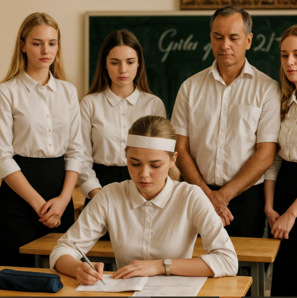 Jej blada twarz i delikatnie drżące dłonie, a także powolne kroki wyglądały, jakby każdy ruch wymagał ogromnego wysiłku. Mieszkańców szkolnego podwórza ogarnęło zaskoczenie, które trudno było ukryć. Tylko jedna osoba natychmiast zrozumiała wyjątkowość tej chwili – długoletni nadzorca egzaminów, profesor Dawson, patrzył na nią ze zdumieniem.