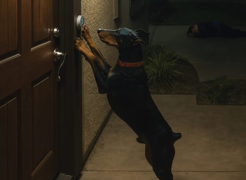 „Nie rozumiem…” – wyszeptał. „Przed drzwiami stoi ogromny pies. Doberman. On… on dzwoni do dzwonka.”