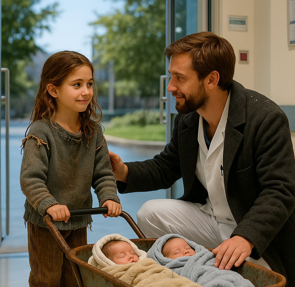 Oddział ratunkowy w szpitalu St. Helena tętnił życiem, jednak nikt nie był przygotowany na to, co miało się wydarzyć w pochmurny poranek. Mała dziewczynka, bosa i drżąca, wprowadziła wytartą taczkę do lobby. W środku, owinięte w stary zasłonę, leżały dwa noworodki o twarzach bladych jak światło świecy, ale wciąż oddychające. Jej włosy przywarły do policzków, kolana drżały z każdym krokiem, a głos trząsł się, gdy mówiła.