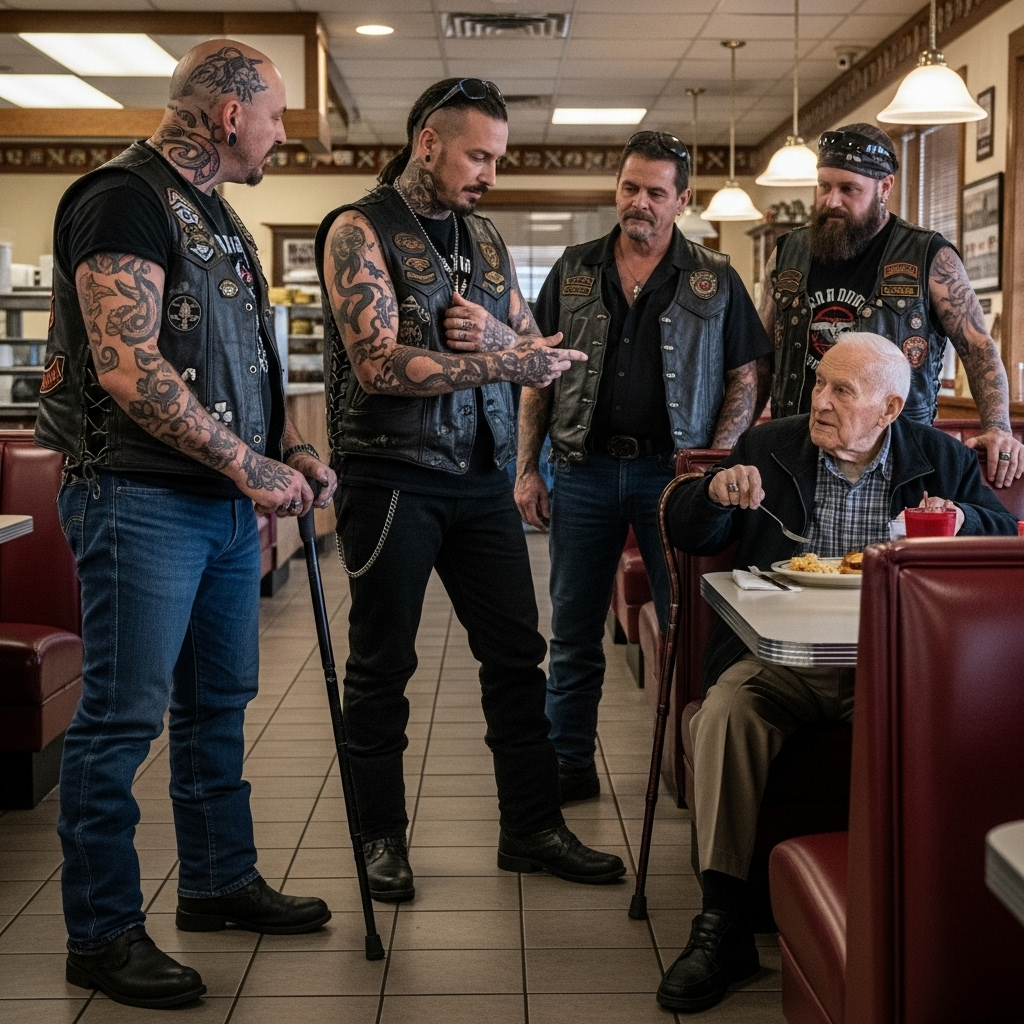Weszło pięciu muskularnych motocyklistów, których ciężkie buty dudniły po kafelkach. Skórzane kurtki, widoczne tatuaże i głośny śmiech zmieniły energię we wnętrzu w mgnieniu oka. Zajęli pół sali, powodując, że kilku stałych bywalców wycofało się cicho na zewnątrz.