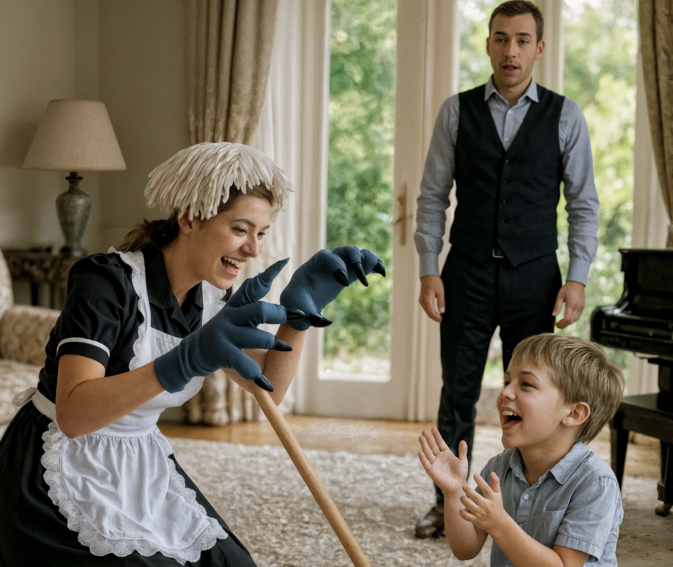 Wchodząc do willi, Thomas zauważył, że wszyscy pracownicy byli nieobecni — zwolnił ich na chorobowe, wysyłając wiadomość dzień wcześniej. Z zabawką w jednej ręce i teczką w drugiej, wszedł do budynku tylnym wejściem, mając nadzieję zaskoczyć Lucasa. Jednak gdy dotarł do salonu, obraz, który ujrzał, wstrzymał go jak wrytego. Clara, pokojówka, udawała dinozaura, rycząc z mopem na głowie jak grzywka. Lucas śmiał się, z łzami szczęścia w oczach. Clara nie tylko grała — ona wcielała się w rolę. Ryknęła, zatoczyła się, powtórzyła niepretensjonalne ryk i w końcu padła na podłogę, napotykając ją. Lucas podkradł się do niej i objął ją ramionami.